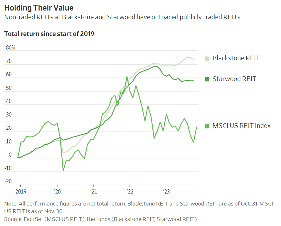 "According to fund filings, there are many adjustments nontraded REITs make to calculate non-GAAP NAV. Some don’t subtract all their liabilities. Some include fair-value gains and losses on their own debt; others don’t. Some update their real-estate assets’ values more frequently than others or rely more heavily on third-party firms to value them."