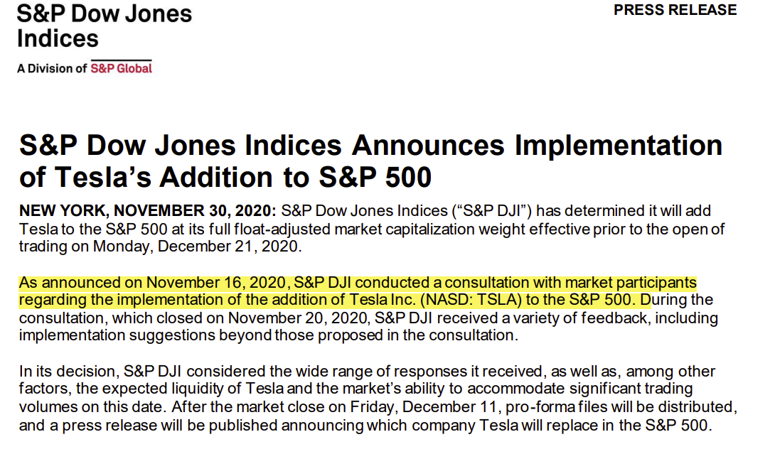 Per Barrons, "the S&P 500 index inclusion came after the blistering hot rally Tesla stock had in 2020. Shares rose more than 740% that year as the company started generating consistent profits and it became clear the Model Y was a big hit. S&P Global, which controls S&P indexes, has several criteria for index inclusion, including profitability metrics." Below is a screenshot of S&P Dow Jones' press release announcing the change: