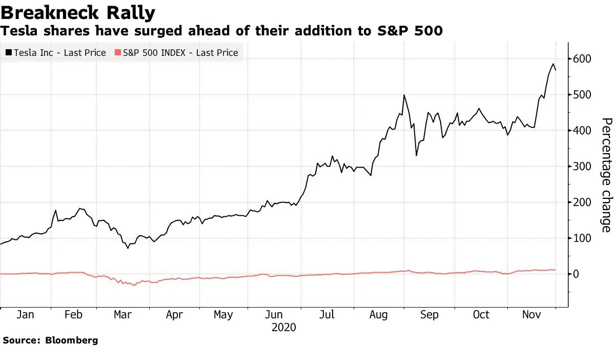 Passive investors didn't exactly benefit from timing, Tesla shares had risen nearly 700% the year they were added to the index.