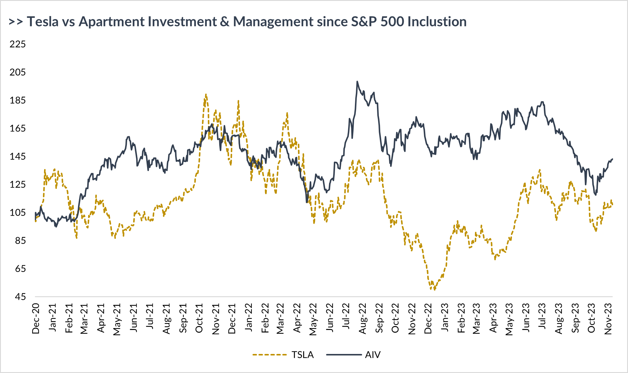 Of course, for a company to be added to the index, one must be removed. Tesla took the place of Apartment Investment & Management Company (AIV) on December 21st, 2020. AIV has a market cap today just over $1 billion, it owns and manages roughly 6,000 apartment units across Colorado, Washington DC and South Florida. Since its exclusion from the index, AIV has risen approximately 43% (13.03% annually) against Tesla's 10.65% (3.50% annually).